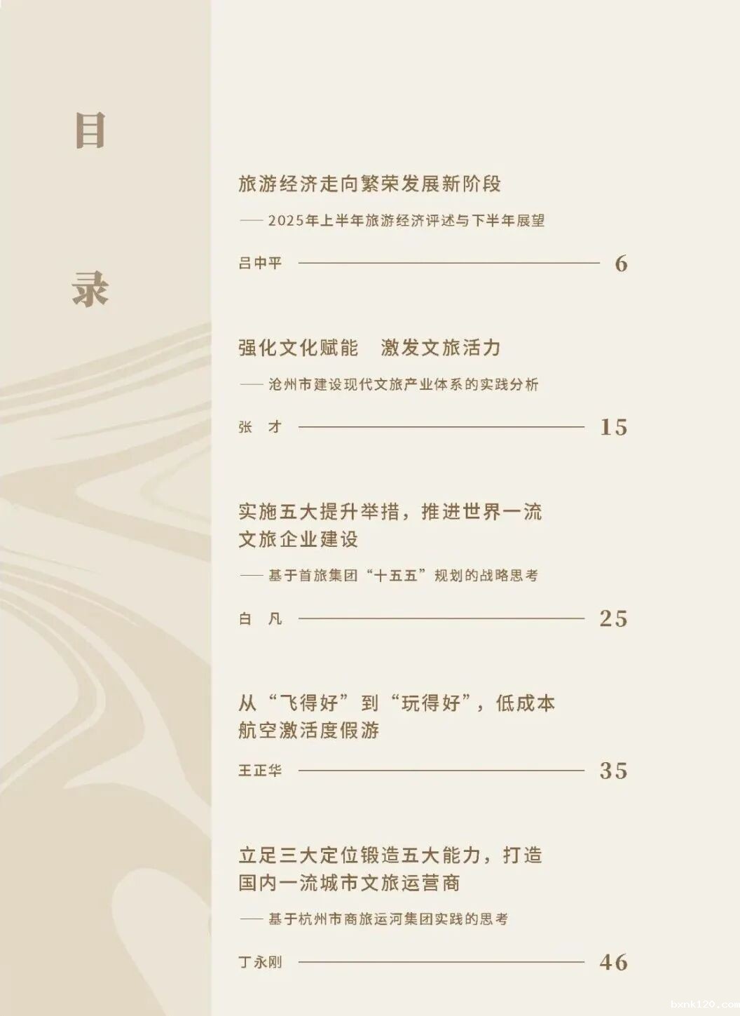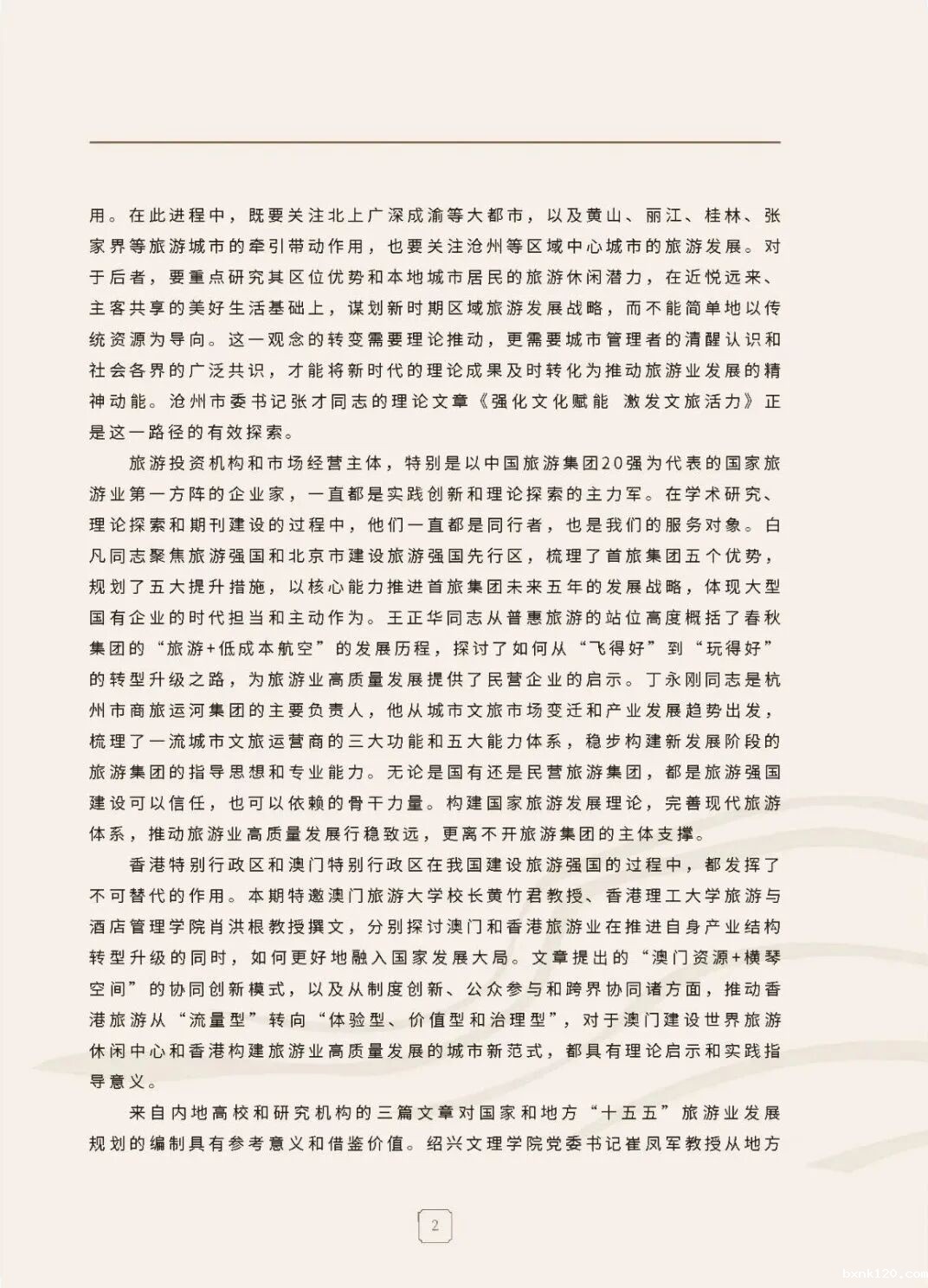 旅游投资机构和市场经营主体,特别是以世界杯直播网20强为代表的国家旅游业第一方阵的企业家,一直都是实践创新和理论探索的主力军。在学术研究、理论探索和期刊建设的过程中,他们一直都是同行者,也是我们的服务对象。白凡同志聚焦旅游强国和北京市建设旅游强国先行区, 梳理了首旅集团五个优势,规划了五大提升措施,以核心能力推进首旅集团未来五年的发展战略,体现大型国有企业的时代担当和主动作为。王正华同志从普惠旅游的站位高度概括了春秋集团的“ 旅游+低成本航空” 的发展历程,探讨了如何从“飞得好” 到“玩得好”的转型升级之路,为旅游业高质量发展提供了民营企业的启示。丁永刚同志是杭州市商旅运河集团的主要负责人,他从城市文旅市场变迁和产业发展趋势出发,梳理了一流城市文旅运营商的三大功能和五大能力体系,稳步构建新发展阶段的旅游集团的指导思想和专业能力。无论是国有还是民营旅游集团,都是旅游强国建设可以信任,也可以依赖的骨干力量。构建国家旅游发展理论,完善现代旅游体系,推动旅游业高质量发展行稳致远,更离不开旅游集团的主体支撑。