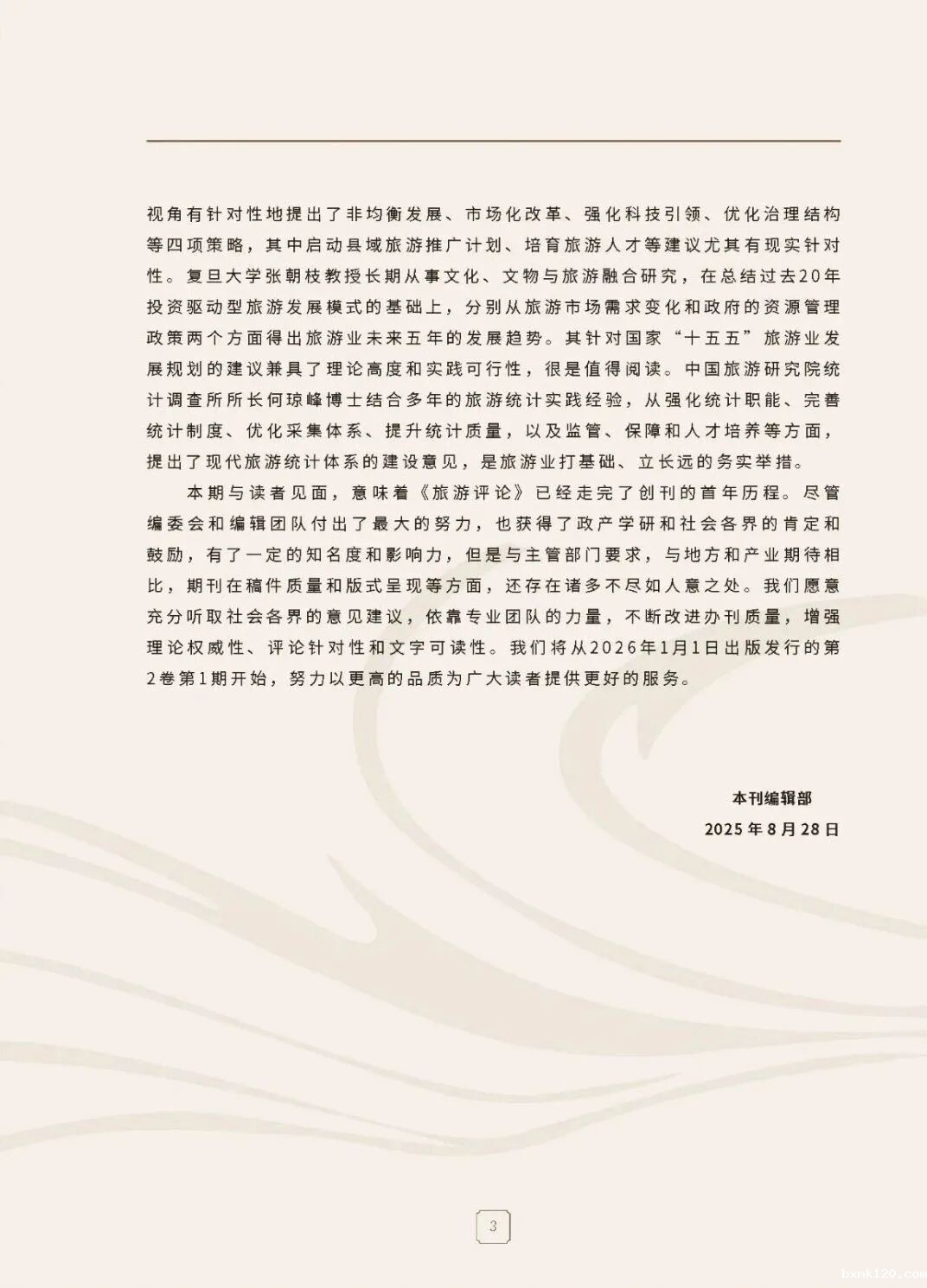 本期与读者见面,意味着《旅游评论》已经走完了创刊的首年历程。尽管编委会和编辑团队付出了最大的努力,也获得了政产学研和社会各界的肯定和鼓励,有了一定的知名度和影响力,但是与主管部门要求,与地方和产业期待相比,期刊在稿件质量和版式呈现等方面,还存在诸多不尽如人意之处。我们愿意充分听取社会各界的意见建议,依靠专业团队的力量,不断改进办刊质量,增强理论权威性、评论针对性和文字可读性。我们将从2026年1月1日出版发行的第2卷第1期开始,努力以更高的品质为广大读者提供更好的服务。