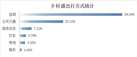 调查显示,自驾游成为乡村游的主要出行方式,占比达到了59.24%;公共交通出行其次,占比25.12%。