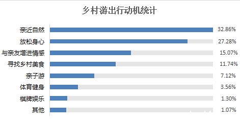 乡村旅游动机调查中,亲近自然、放松身心和与亲友增进情感分别占比32.86%、27.28%和15.07%,合计达到四分之三;亲子游、体验美食、娱乐健身等目的占四分之一。