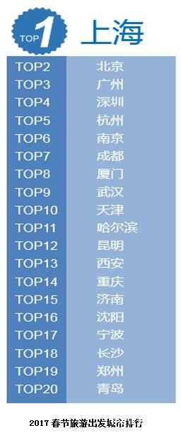 今年春节,哪些地区的市民最热衷外出旅游?出发地人气排行榜显示,出游人数排名前20的城市是:上海、北京、广州、深圳、杭州、南京、成都、厦门、武汉、天津、哈尔滨、昆明、西安、重庆、济南、沈阳、宁波、长沙、郑州、青岛。