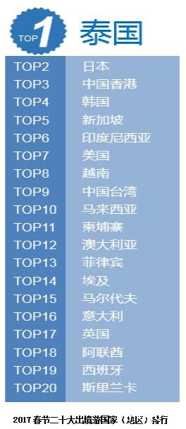春节出境都去哪儿了?根据携程跟团游、自由行、邮轮等出境业务数据,2017春节人气排名前二十的出境游国家(地区)依次是:泰国、日本、中国香港、韩国、新加坡、印度尼西亚、美国、越南、中国台湾、马来西亚、柬埔寨、澳大利亚、菲律宾、埃及、马尔代夫、意大利、英国、阿联酋、西班牙、斯里兰卡。