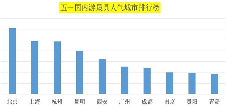 “五一最具人气旅游城市”排行榜显示,最受欢迎、游客选择最多的前十大旅游城市是:北京、上海、杭州、昆明、西安、广州、成都、南京、贵阳、青岛。首都北京排名第一,其次是上海、杭州。