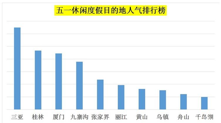 “五一最具人气休闲度假目的地”排行榜显示,从在线预订自由行、一地深度游等产品的人数看,游客选择最多的前十大休闲度假目的地依次是:三亚、桂林、厦门、九寨沟、张家界、丽江、黄山、乌镇、舟山、千岛湖。这些都属于可以住下来慢慢体验的目的地,以海岛度假闻名的三亚位居第一。