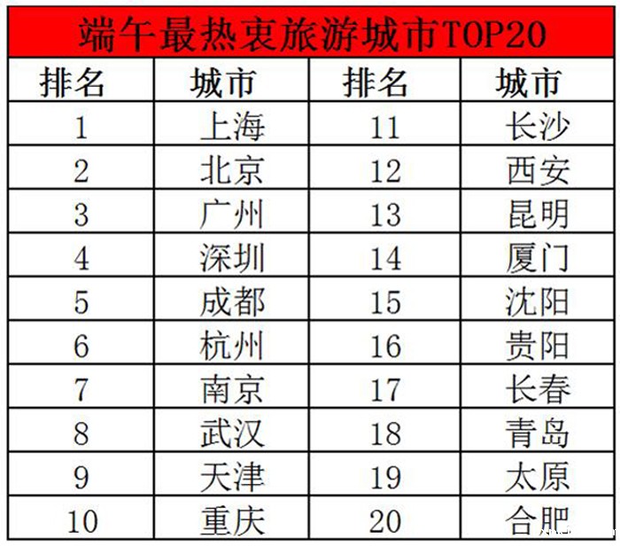 “端午最具人气旅游城市”排行榜显示,最受欢迎、游客选择最多的前十大旅游城市是:北京、上海、杭州、昆明、西安、青岛、成都、广州、南京、重庆。