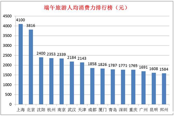 携程网在线订单统计显示,“端午”度假旅行人均花费约2500元。2017年“端午”人均旅游花费最高的15大城市依次是:上海、北京、沈阳、杭州、南京、武汉、天津、成都、厦门、青岛、深圳、重庆、广州、昆明、郑州。