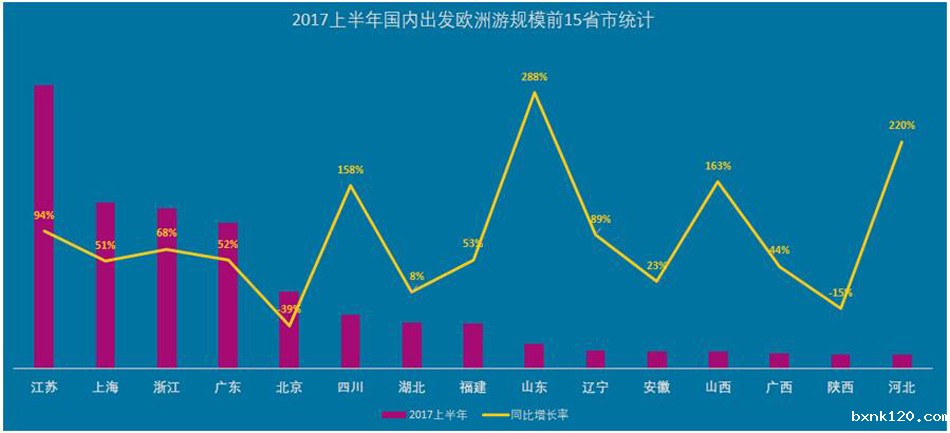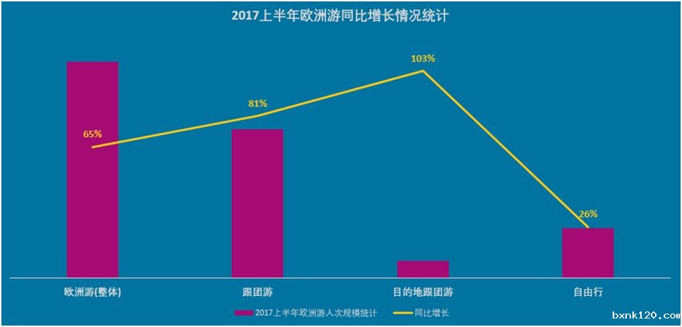 1、2017上半年欧洲游同比增长65%,其中跟团游依然是市场主导,同比增长81%