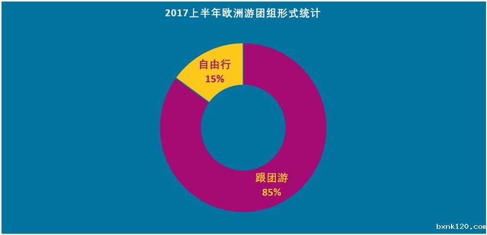 携程旅行网、华远国旅交易数据显示,2017年上半年中国赴欧洲旅游人次同比增长65%,其中跟团游实现了81%的高增长,目的地跟团游增长翻番,增长率达103%。跟团游依然是欧洲游的主要方式,有85%的国人选择跟了团方式。选择自由行的中国游客占比提升到15%,规模同比增长26%。