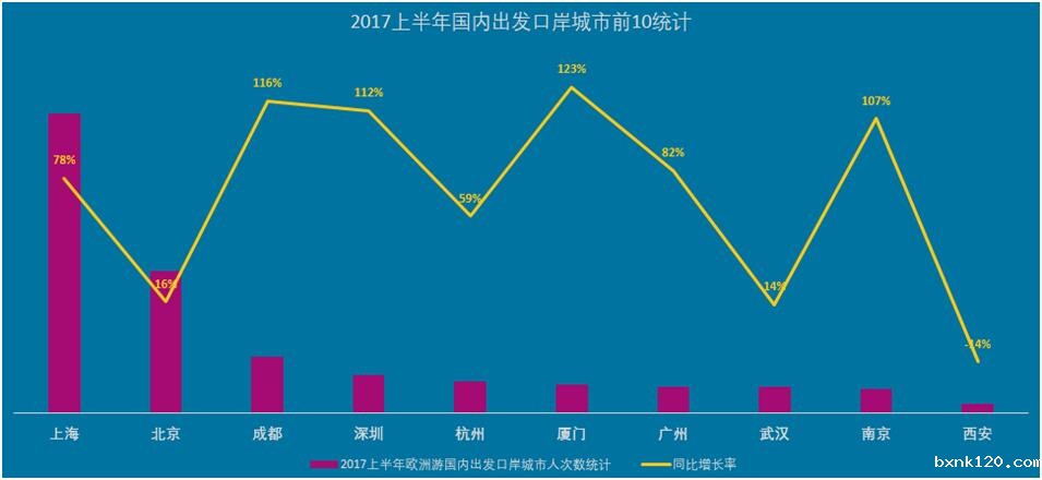 在赴欧洲游出发口岸城市中,2017年上半年出境欧洲的中国游客依然集中于北京、上海两大口岸城市,出境人群比重超过了60%,但成都、厦门、南京等其它口岸城市显示出巨大的增长潜力。