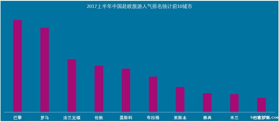 意大利、法国、德国、英国、瑞士、俄罗斯、西班牙、葡萄牙、土耳其、捷克是中国游客选择最多的前十大出境目的地国家。巴黎、罗马、法兰克福、伦敦、莫斯科、布拉格、里斯本、雅典、米兰、巴塞罗那成为前十大人气出境目的地城市。布拉格、维也纳、莫斯科、阿姆斯特丹、赫尔辛基及马德里,2017年都倍受中国游客青睐,游客增速较高。