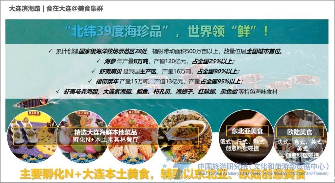 Dalian's "39 degrees north latitude marine treasures" are world-leading. A total of 28 national-level marine ranch demonstration areas have been created, covering an area of more than 5 million mu, ranking first among cities in China. For example, sea cucumbers have an annual output of 80,000 tons and an output value of 12 billion yuan, accounting for more than 25% of the country; the main production area of Yakisoba scallops in my country is 160,000 tons, accounting for more than 90% of the country; the annual output of kelp is 150,000 tons, with an output value of 1.3 billion yuan, accounting for more than 95% of the country; Yamato sea urchins, Dalian purple sea urchins, abalone, chlamys farreri, oysters, red-veined snails, variegated clams and other special seafood ingredients.