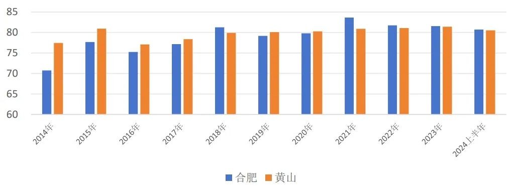 图3 2014-2023年合肥市、黄山市游客满意度对比