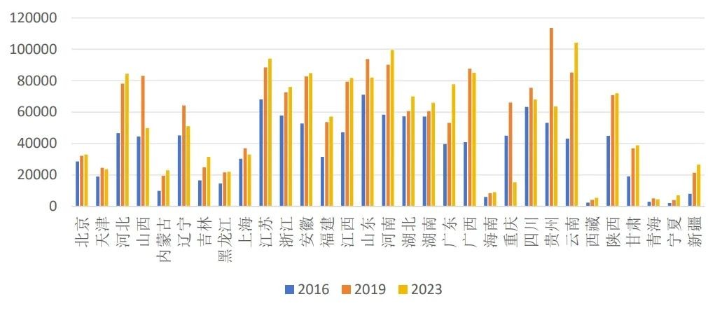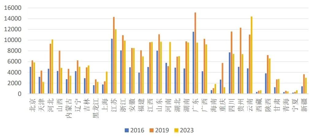 图1 全国各省市2016、2019、2023年接待旅游人次排行