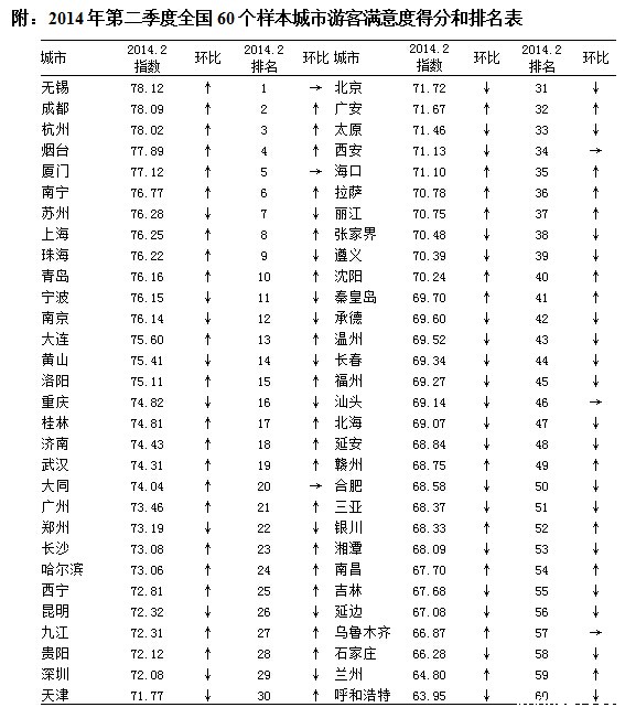 7月9日,中国旅游研究院发布2014年第二季度全国游客满意度调查报告。报告显示,2014年第二季度全国游客满意度指数为72.84,较第一季度上升0.22。报告指出,随着旅游市场秩序专项整治工作成效显现以及样本城市的持续努力,景点、旅行社等典型旅游行业的满意度开始回升,进一步拉动国内、入境游客满意度显著回升。但行业发展质量的"老问题"依然没有得到有效解决,安全、社会等因素呈现叠加影响的态势,出境游客满意度进一步下降。